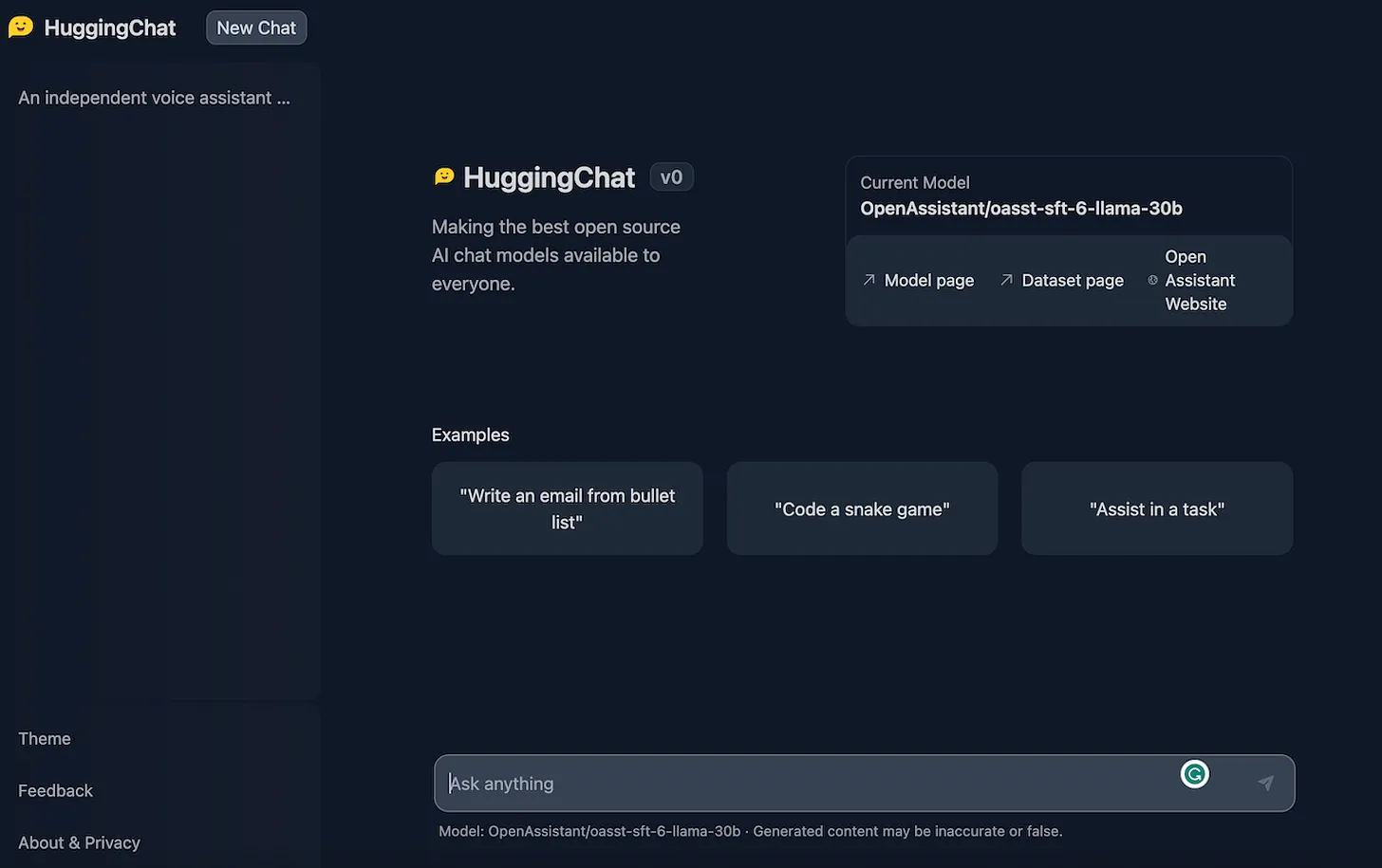 HuggingChat merupakan chatbot yang dikembangkan oleh Hugging Face dan dapat digunakan sebagai chatbot biasa atau disesuaikan untuk kebutuhan penggunanya. Chatbot ini memungkinkan pengguna memiliki visibilitas ke setiap aspek fungsinya. HuggingChat dapat diakses melalui situs https://huggingface.co/chat/.