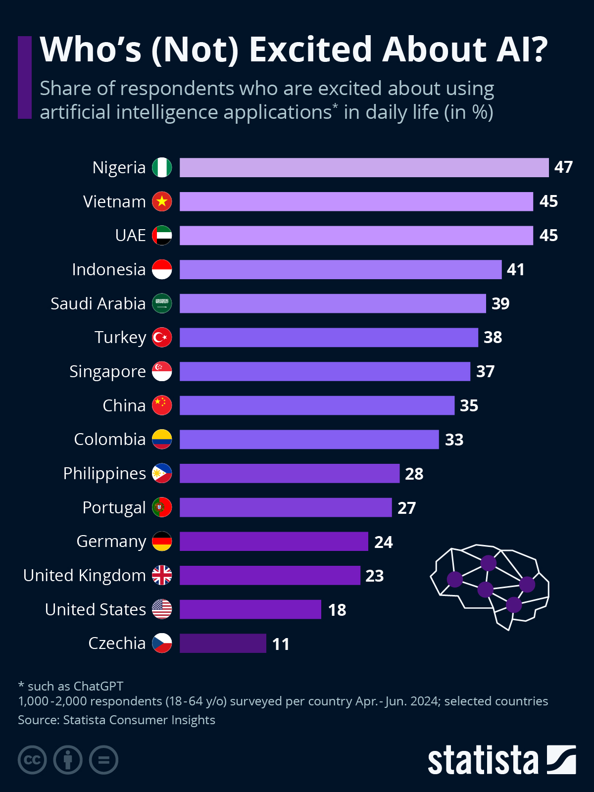Selain itu, masyarakat Republik Ceko memberikan nilai yang sangat rendah dengan hanya 11 persen orang yang turut senang terhadap perkembangan AI.