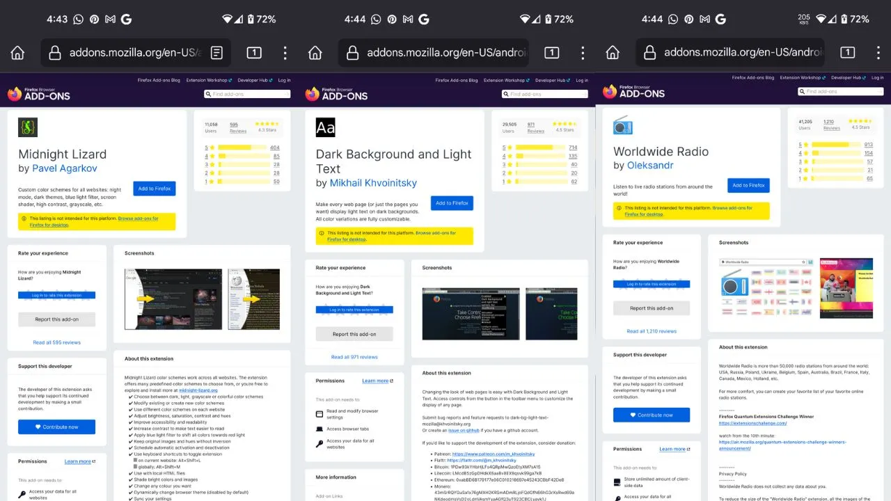 Ekstensi tersebut antara lain adalah uBlock Origin dan Ghostery sebagai pemblockir konten yang fokus pada privasi, Privacy Badger sebagai anti-tracking, dan Dark Reader sebagai pengubah warna tampilan. Selama beberapa bulan mendatang, Mozilla berencana untuk menambahkan lebih banyak ekstensi agar pengguna dapat memilih dan menyesuaikan pengalaman internet seluler mereka.