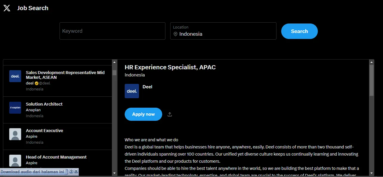Pengguna juga hanya tinggal klik "Apply now" untuk melamar pekerjaan. Setelahnya nanti pengguna akan dialihkan ke tab baru dengan URL "jobs.lever.com/(perusahaan) atau langsung ke situs resmi perusahaan.