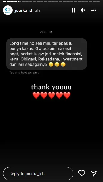 Dalam postingan Instagram story tersebut, banyak pengikut dari @jouska_id yang menanyakan mengenai kejadian yang sebenarnya terjadi. Mereka meminta kepastian akan kejadian tersebut. Selain itu, beberapa pengikut juga menyatakan rasa terima kasihnya kepada perusahaan Jouska yang telah menyadarkan mereka mengenai dunia keuangan dan investasi.