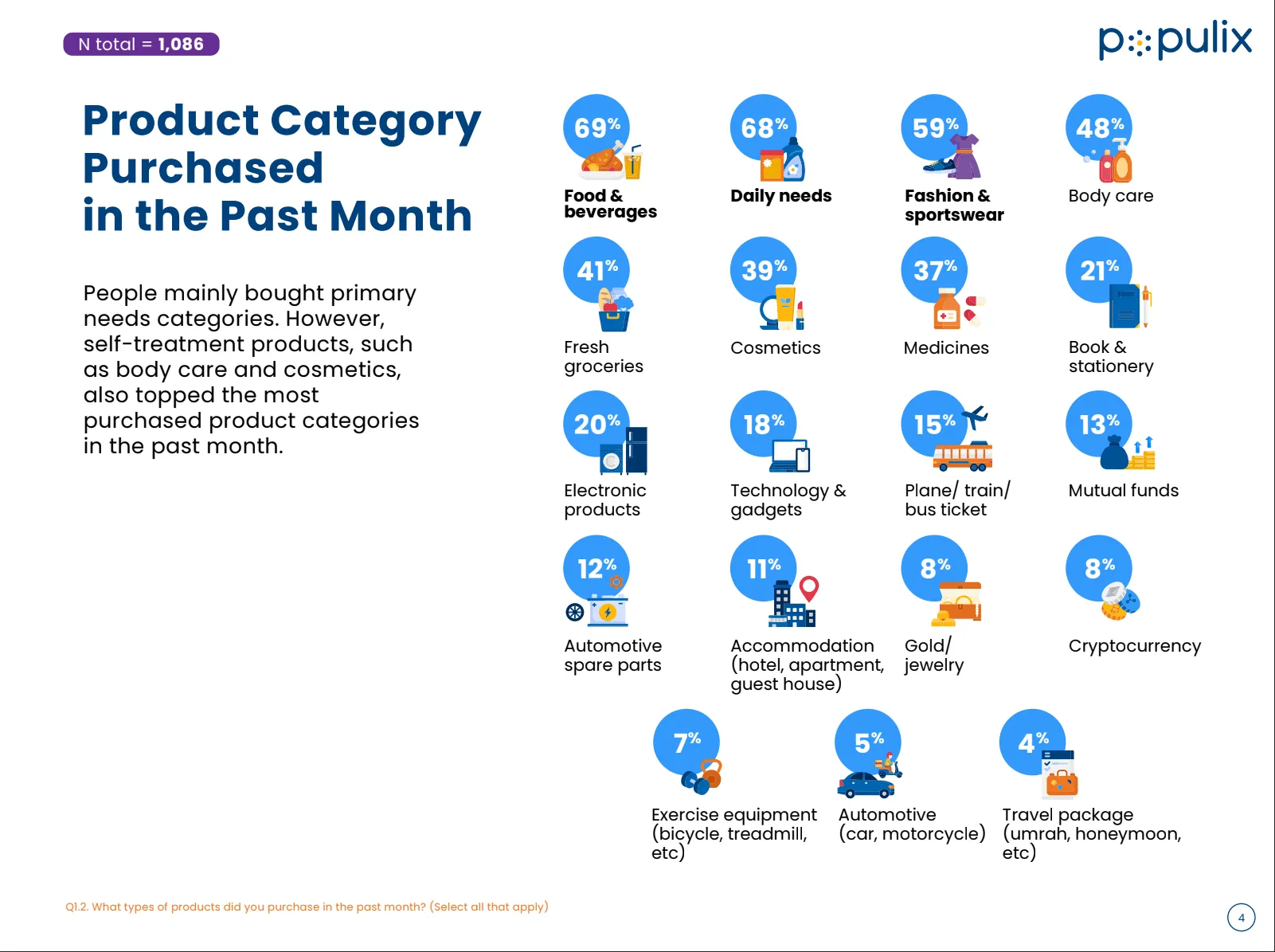 Berdasarkan laporan dari Populix dalam "Indonesian Shopper Behaviour, on Promotion Week in the Face of Economic Uncertainty 2023", masyarakat Indonesia sebagian besar membelanjakan uang mereka untuk makanan dan minuman dibandingkan dengan membeli pakaian dan barang perawatan pribadi secara online (daring). Menurut laporan tersebut, kategori makanan dan minuman menduduki peringkat pertama dengan 69%, kedua dengan 68% untuk kebutuhan sehari-hari, dan ketiga dengan 59% untuk fashion dan pakaian olahraga.
