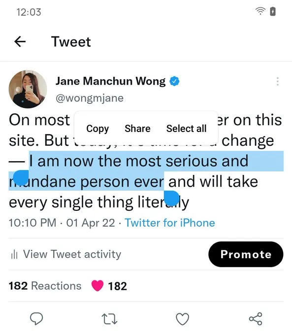 Beberapa pengguna Android mungkin menganggap fitur baru ini sebagai fitur lama karena ada ponsel yang memiliki kemampuan yang tidak dapat dijelaskan untuk memilih teks dari Tweet. Namun, itu terbatas hanya pada beberapa merek ponsel, termasuk Google Pixel, jadi ini bukan fitur standar platform. Pasti akan menjadi hal yang baik untuk membuat pemilihan teks tersedia untuk semua pengguna, mungkin termasuk yang ada di Twitter Lite. (aks)