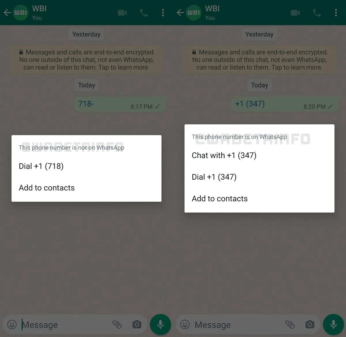 Jika kontak yang belum disimpan tidak memiliki akun WhatsApp, pop-up hanya memberi kita opsi untuk memanggil nomor tersebut atau menambahkannya ke kontak.
