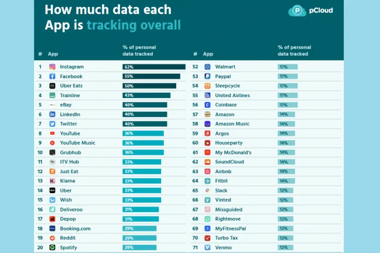 Dari riset berjudul "The most invasive apps: which apps are sharing your personal data?", pCloud membuat daftar 20 aplikasi yang paling banyak melacak dan membagikan data penggunanya.