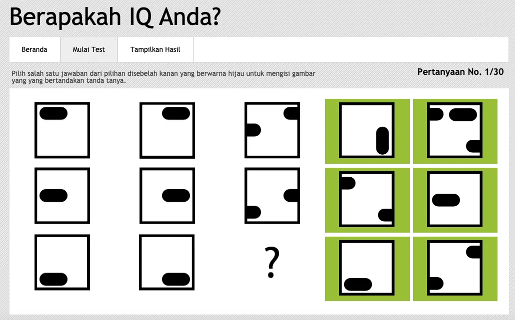 Situs untuk tes IQ yang pertama adalah Quickiqtest.net. Satu kelebihan dari situs ini adalah ringan untuk diakses. Sehingga jika kamu memiliki permasalahan koneksi internet yang lambat, maka kamu masih bisa mengaksesnya dengan relatif mudah.