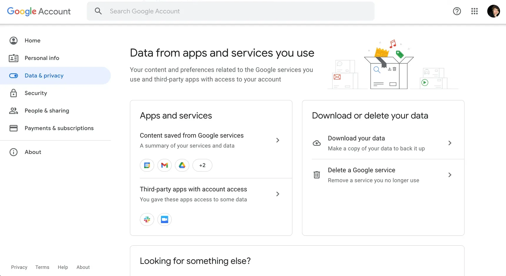 • Scroll ke bawah ke “Unduh atau hapus data kita”, Klik "Unduh data kita".