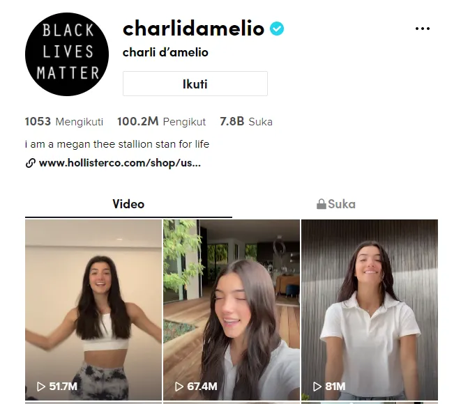Teknologi.id - Charli D’Amelio adalah kreator TikTok pertama yang berhasil mendapatkan 100 juta followers. Dia juga menjadi orang pertama yang memperoleh angka 50 juta followers pertama, sebelumnya. Fakta menarik dari jumlah followers Charli di TikTok adalah jumlahnya dua kali lebih besar dari followers Will Smith, tiga kali lebih besar dari followers The Rock, empat kali lebih besar dari followers Selena Gomez, dan lima kali lebih besar dari followers Kylie Jenner dan Ariana Grande.