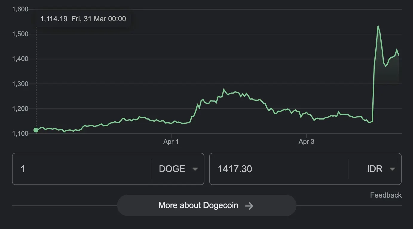 Pada tahun 2021, harga Dogecoin melonjak 35 persen setelah Elon Musk mengirimkan beberapa twit tentang mata uang kripto tersebut. Dalam waktu 24 jam, harga Dogecoin mencapai puncak tertingginya yaitu dari 0,048356 dollar AS menjadi 0,065448 dollar AS.