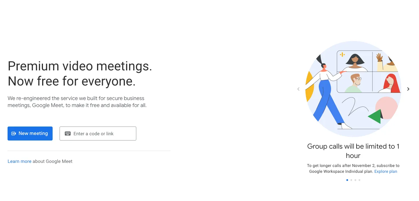 Pengguna tetap dapat menggunakan layanan Google Meet hanya saja terbatas yaitu untuk peserta 3 orang atau lebih selama 60 menit saja.