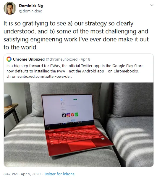 Sesungguhnya, PWA sudah hadir di Google Play Store sebelumnya. Namun, khusus untuk perangkat Chrome OS, PWA akan dijadikan default untuk aplikasi-aplikasi yang diperbaharui Google, seperti Twitter dan Youtube TV.
