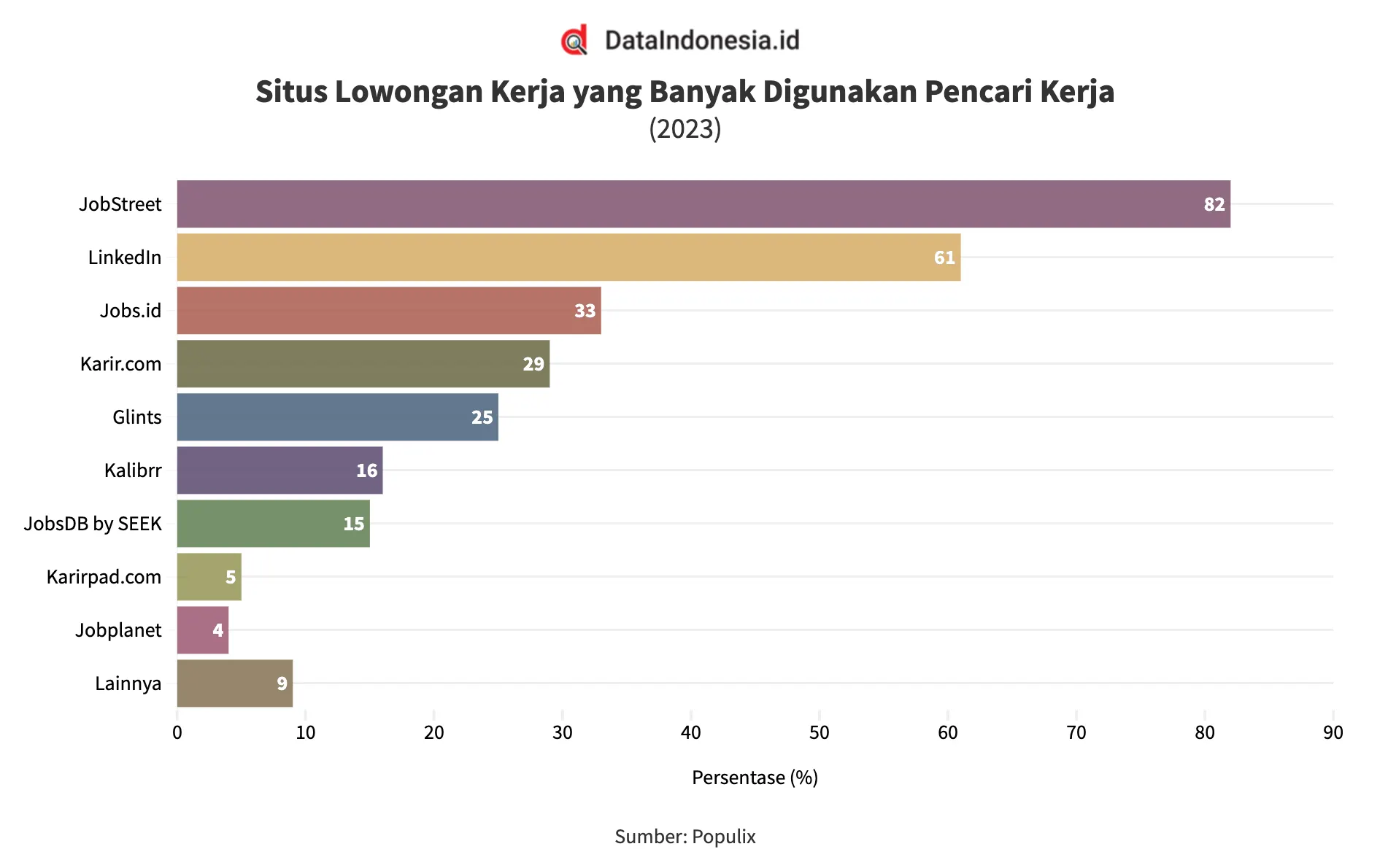 Pada posisi pertama dipegang oleh JobStreet, platform online yang menyediakan ribuan lowongan pekerjaan dari berbagai perusahaan di Indonesia ini telah menjadi platform paling populer yang digunakan oleh para pencari kerja di Indonesia dengan total 82 persen dalam sebuah survei yang dilakukan oleh Populix.