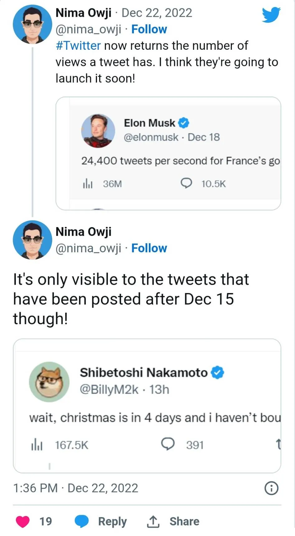 Terlepas dari kehebatan view counts, peluncuran fitur ini masih membutuhkan waktu untuk dapat menjangkau seluruh pengguna Twitter. Saat ini, view counts hanya bisa diakses melalui iOS dan Android, dan direncanakan untuk segera meluncur ke web. Nima Owji, seorang peneliti aplikasi mengemukakan hasil pengamatannya bahwa fitur view counts hanya dapat diterapkan kepada tweet yang dibagikan sejak tanggal 15 Desember 2022.