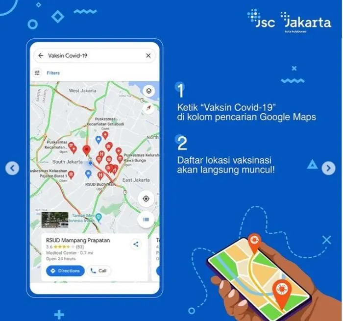 Fitur pencarian lokasi vaksinasi COVID 19 ini merupakan hasil kerja sama antara Dinas Kesehatan Provinsi DKI Jakarta, Google Maps, dan Jakarta Smart City. Untuk keterangan lebih lanjut kamu bisa membaca ketentuan lebih lanjutnya di corona.jakarta.go.id/vaksinasi