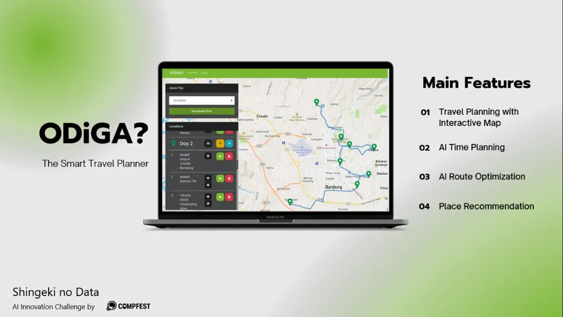 Tim bekerja sama untuk mengembangkan aplikasi Odiga untuk membantu masyarakat yang ingin menghabiskan waktu liburannya dengan efisien. Lalu apa yang membuat aplikasi Odiga menjadi begitu spesial hingga bisa merebut hati para juri universitas ternama UI? Simak penjelasannya sebagai berikut.