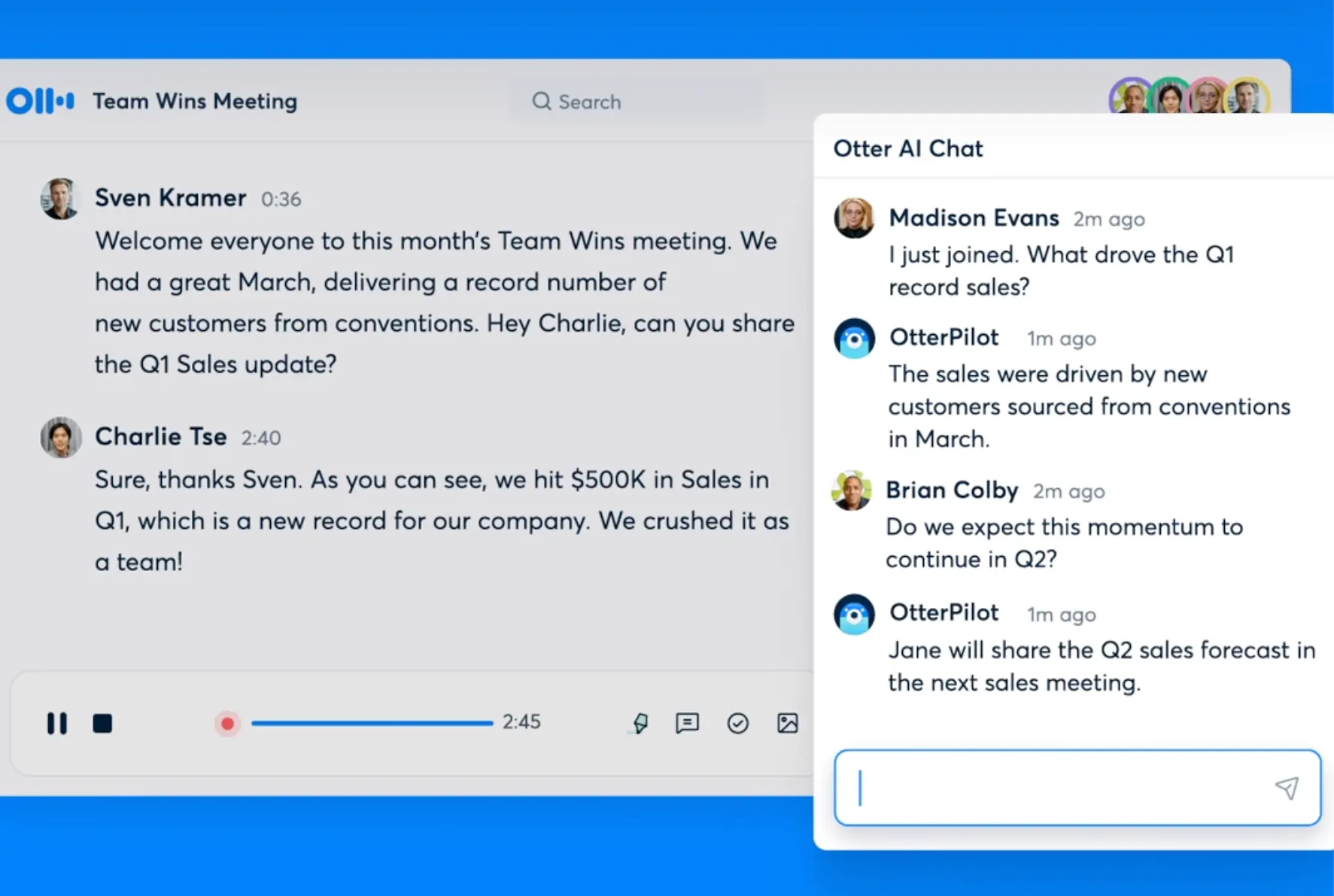 "Rapat adalah percakapan di antara banyak orang dan itulah mengapa Otter AI Chat bergabung dalam percakapan, menjawab pertanyaan, membuat konten, menangkap item tindakan, dan berkomunikasi dengan beberapa peserta rapat secara langsung (atau setelah) rapat. Ini merupakan lompatan transformasional yang memberdayakan tim untuk memanfaatkan nilai maksimal dari rapat mereka dengan cara yang kolaboratif dan cerdas dengan AI - kapan pun dan di mana pun mereka membutuhkannya." ujar Sam.