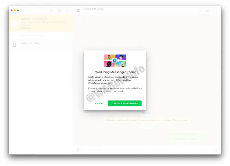 Dilaporkan oleh WABetaInfo, bahwa mereka menemukan sebuah tautan ke Messenger Rooms pada versi terbaru WhatsApp Web. Fitur ini mirip dengan yang ada pada WhatsApp Beta versi Android.