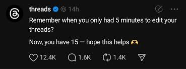 Fitur ini tidak hanya meningkatkan pengalaman pengguna, tetapi juga menunjukkan komitmen platform untuk memberikan fleksibilitas dan kontrol lebih kepada penggunanya. Pengguna Threads kini diberi waktu 15 menit untuk mengedit postingan mereka, berbeda dari sebelumnya yang hanya 5 menit. Durasi ini dihitung sejak postingan diunggah di linimasa Threads, memberi pengguna lebih banyak waktu untuk memperbaiki kesalahan atau menyesuaikan pesan mereka.