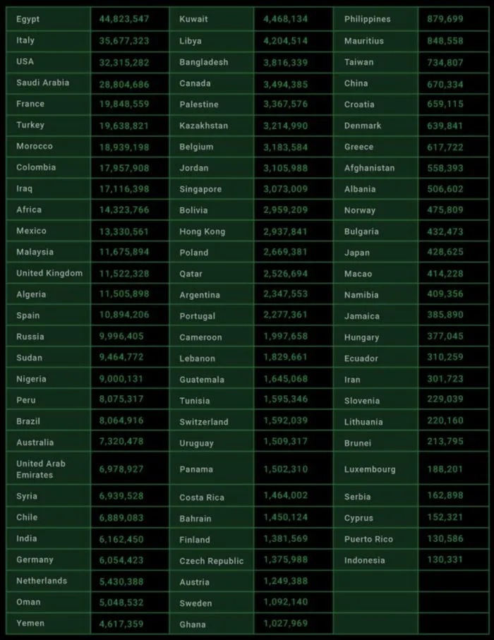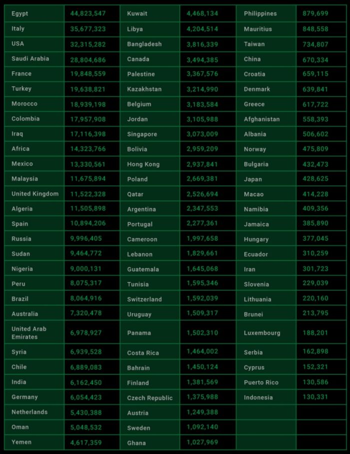 Mesir menjadi negara dengan perolehan jumlah terbanyak dalam kasus ini yang tercatat sekitar 44,8 juta pengguna mengalami kebocoran nomor WhatsApp. Kemudian ada Italia dengan jumlah sebesar 35,5 juta orang mengalami kebocoran. Urutan ke-3 ada negeri Paman Sam dengan jumlah 32,2 juta nomor.