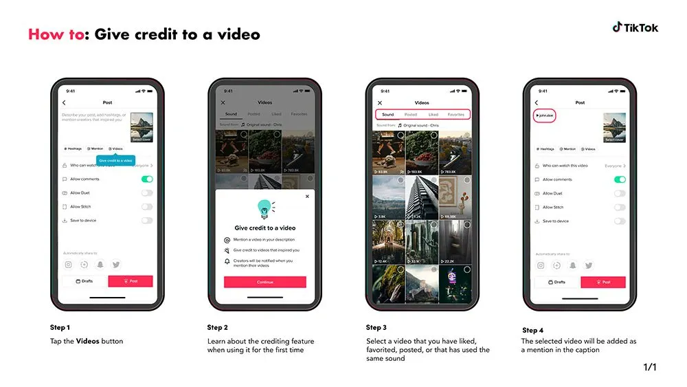 Tombol ini memungkinkan kreator memberi kredit pada segala macam inspirasi untuk konten mereka, termasuk tarian, lelucon, suara viral, dan banyak lagi -- hal ini akan membantu pengguna TikTok menemukan pembuat asli di balik tren terbaru dengan mengetuk kredit dari teks video tersebut.