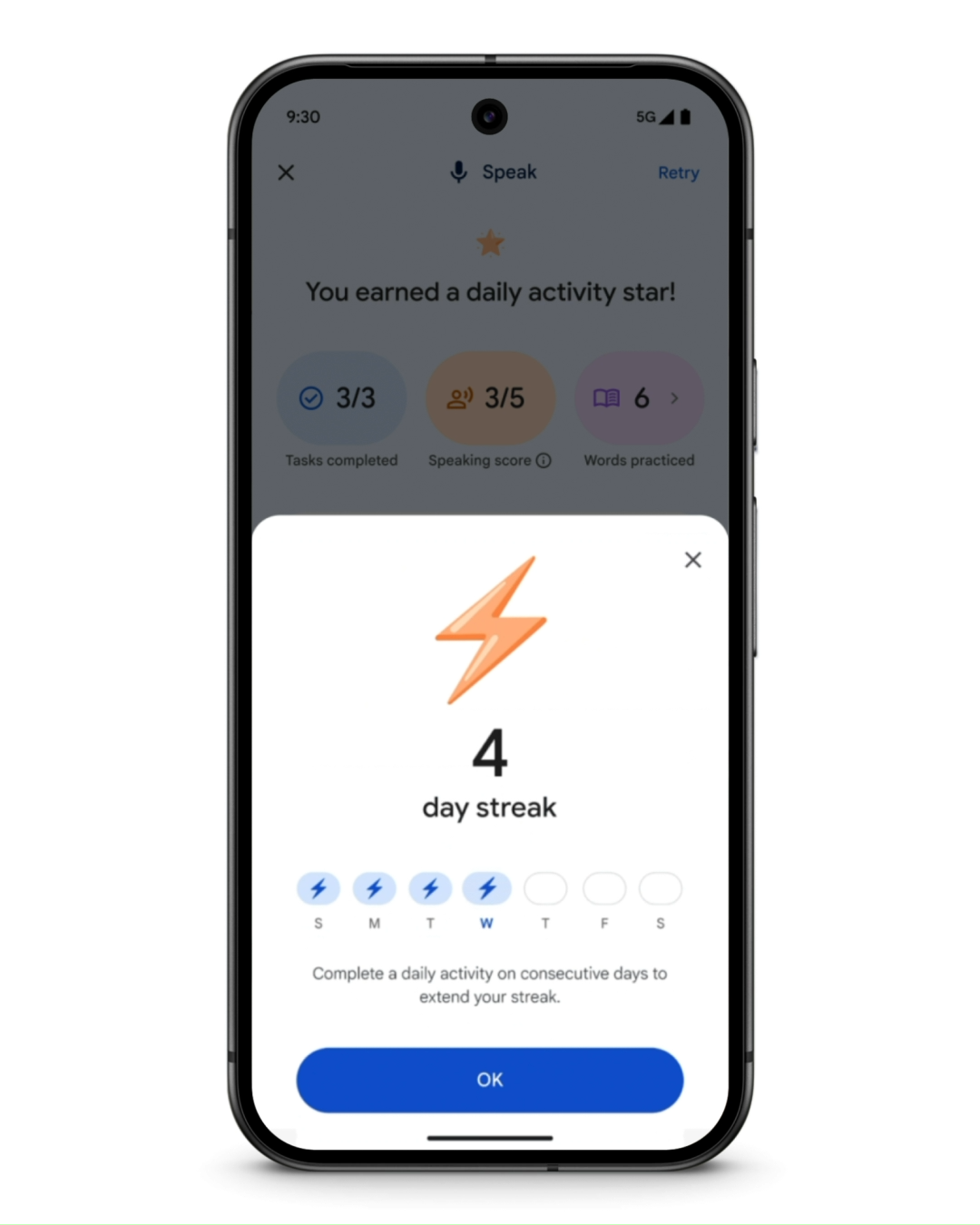 Peningkatan pentingnya adalah perkenalan umpan balik yang lebih baik, menawarkan tips bermanfaat berdasarkan latihan berbicara pengguna. Selain itu, Google menambahkan fitur motivasi untuk membantu pengguna mencapai tujuan belajar mereka: melacak sudah berapa hari berturut-turut mereka sudah belajar (streak) Progres ini dan pelacak konsistensi memberikan visual jelas yang mewakili perkembangan seiring waktu.