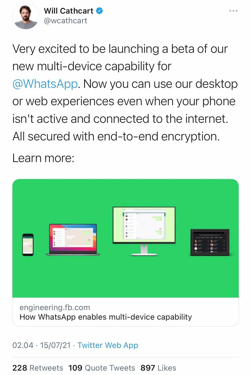 Cathard juga menjelaskan fitur Multi-device sudah di proses sejak lama. Fitur desktop dan web befungsi sebagai mirroring dari Whatsapp ponsel yang berarti ponsel harus terus menyala dan terhubung ke internet jika ingin mengakses Whatsapp web.