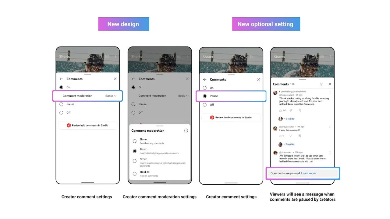 Selain fitur Pause, YouTube juga melakukan perubahan pada nama beberapa pengaturan moderasi komentar dalam pengumuman ini. Perubahan nama ini bertujuan untuk membuat pengguna lebih mudah memahami fungsi dari setiap pengaturan. Berikut ini adalah daftar pengaturan moderasi komentar yang tersedia saat ini: