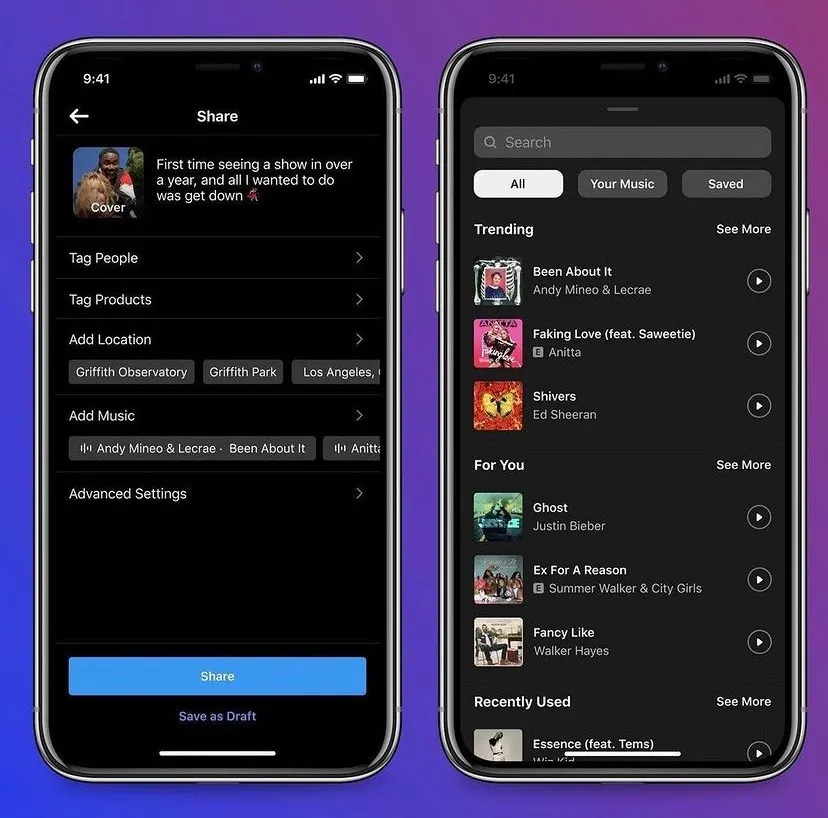 Sama seperti Stories, pengguna juga bisa memilih bagian lagu yang ingin dimasukkan ke dalam konten, beserta durasinya. Setelah itu, konten dapat diunggah lengkap dengan musik yang telah dipilih. Judul lagu sendiri akan tampil di bagian atas postingan, sama seperti konten Reels dan Stories. Bila diklik, maka akan tampil konten Feeds apa saja yang telah menggunakan lagu tersebut.