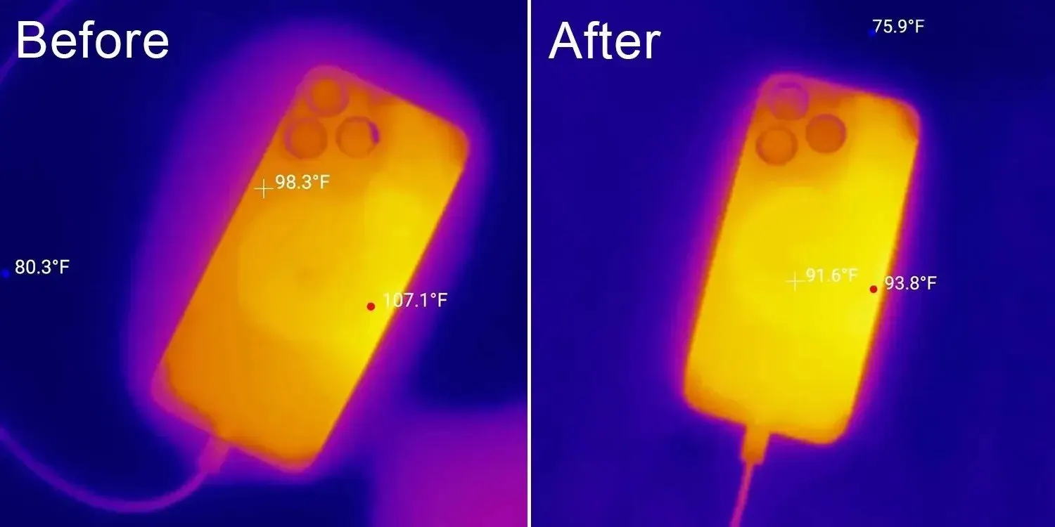 Sebelum melakukan pembaruan iOS 17.0.3, suhu iPhone 15 Pro dan Pro Max sering melebihi 37,7 derajat Celsius saat diisi baterainya menggunakan teknologi fast charging berdaya 35 Watt. Titik terpanas terletak di sisi kiri ponsel, sebrang modul kamera belakang dengan suhu mencapai sekitar 41,7 derajat Celsius.