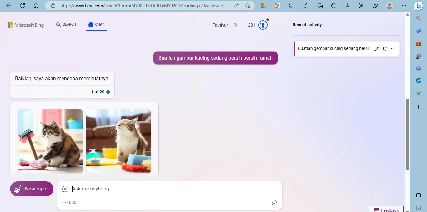 Salah satu fitur menarik Bing AI adalah kemampuannya untuk mengubah teks menjadi gambar. Misalnya, jika Kamu menuliskan deskripsi tentang suatu objek atau pemKamungan, Bing AI dapat menghasilkan gambar yang sesuai dengan deskripsi tersebut. Ini sangat berguna jika Kamu ingin memvisualisasikan ide atau konsep tertentu dalam bentuk gambar. Contohnya, Bing AI diminta untuk membuat gambar kucing yang sedang bersih-bersih. Bing AI pun akan menghasilkan gambar kucing yang sedang menyapu dan mengepel lantai.