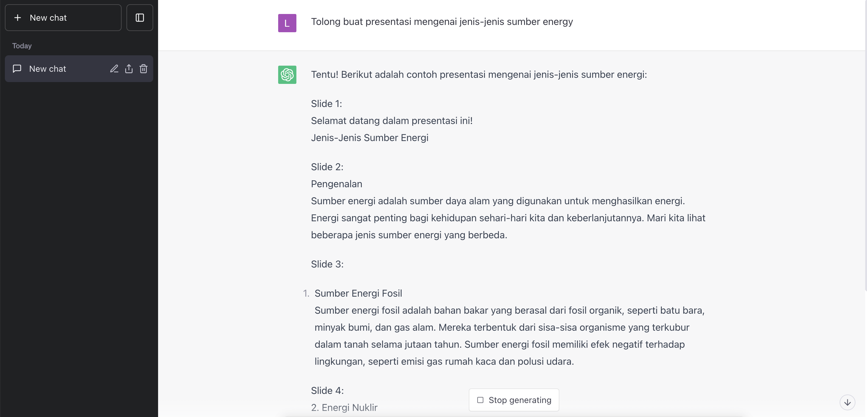 Setelah mengakses ChatGPT, mulailah percakapan dengan memberikan masukan atau pertanyaan yang sesuai terkait topik presentasi. Misalnya, bisa memulai dengan masukan seperti, "Tolong buat presentasi mengenai jenis-jenis sumber energy.”