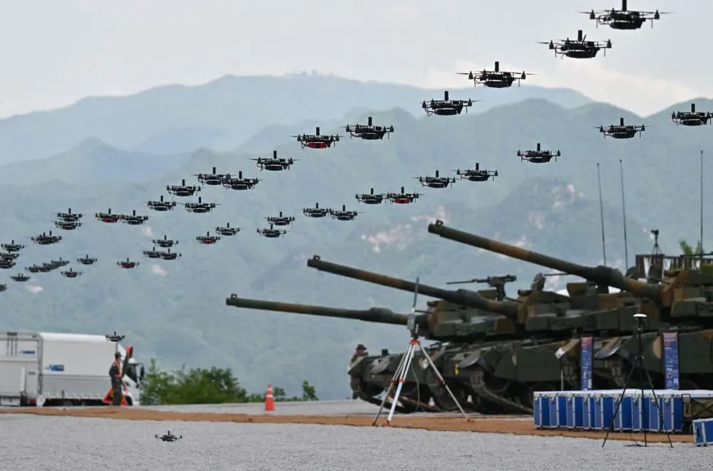Foto: Drone militer Korea Selatan terbang berformasi selama latihan militer bersama dengan AS di Lapangan Latihan Pemadam Kebakaran Seungjin di Pocheon pada 25 Mei 2023.