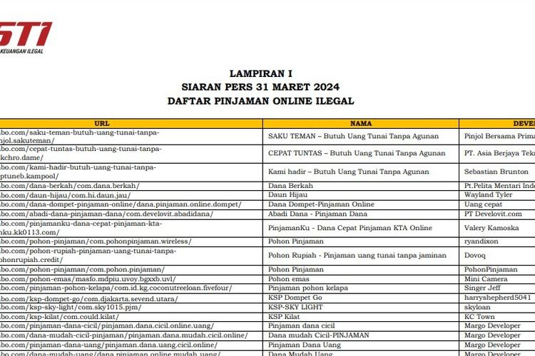 Daftar 537 Pinjol Ilegal Periode Februari-Maret 2024