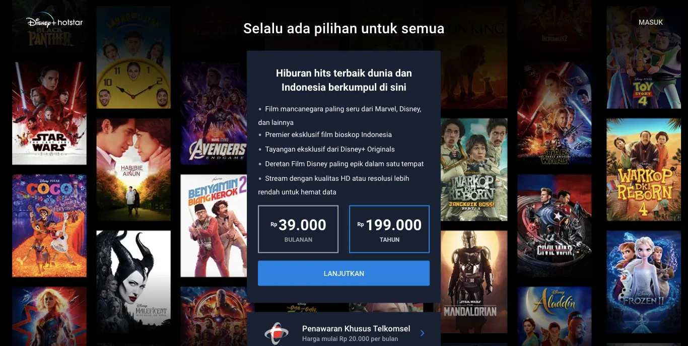 Sejak resmi dirilis di Indonesia pada September 2020 lalu, Disney+ Hotstar langsung resmi menggandeng perusahaan telekomunikasi terbesar di Indonesia, Telkomsel. Strategi bisnis ini langsung mendongkrak jumlah pengguna Disney+ Hotstar di Indonesia karena Telkomsel memberikan kemudahan bahkan promo untuk pelanggan Telkomsel yang ingin berlangganan Disney+ Hotstar. Hal ini tentu berbeda dengan Netflix yang masih harus menggunakan kartu kredit untuk berlangganan, dimana tidak semua orang memiliki kartu kredit. Harga berlangganan yang ditawarkan Disney+ Hotstar pun cukup bersaing, yaitu Rp 39.000 per bulan atau Rp 199.000 per tahun.