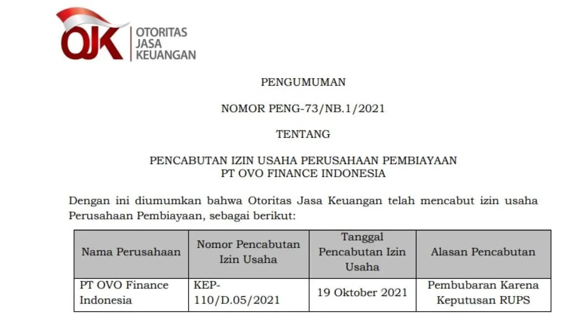 "Otoritas Jasa Keuangan melalui Keputusan Dewan Komisioner Otoritas Jasa Keuangan Nomor KEP-110/D.05/2021 tanggal 19 Oktober 2021 telah mencabut izin usaha Perusahaan Pembiayaan PT OVO Finance Indonesia," kata OJK.