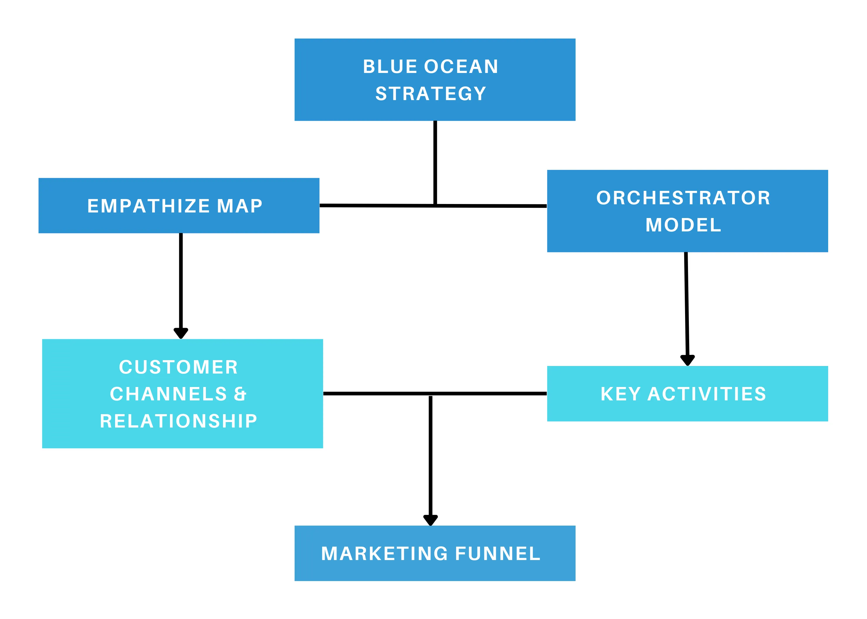 Langkah pertama dalam membangun orchestrator marketing funnel adalah mengidentifikasi nilai unggul yang dimiliki perusahaan dengan menggunakan strategi blue ocean (samudera biru). Strategi samudera biru membantu perusahaan menciptakan nilai dan inovasi yang belum ada sehingga tercipta pasar yang baru. Penting bagi perusahaan untuk mengetahui posisinya terlebih dahulu, sehingga bisa menghilangkan faktor yang tidak bermanfaat dan meningkatkan sumber daya yang penting tetapi masih berada di bawah standar. Setelah itu, perusahaan membuat strategi baru dan meningkatkan sumber daya yang sudah baik untuk mewujudkan pasar yang baru (Leavy B, 2019).