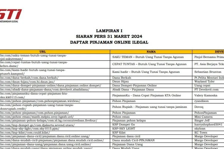 Masyarakat dapat melihat daftar pinjol ilegal yang terbaru hingga tanggal 31 Maret 2024, sehingga mereka dapat menghindari kerugian-kerugian yang tidak diinginkan. Berikut daftar pinjol ilegal dapat dilihat disini