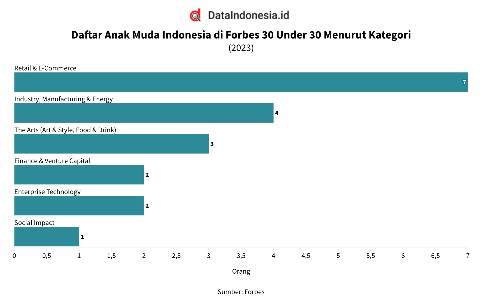 Tahun 2023 ini, Forbes telah merilis daftar 30 Under 30 Asia. Berdasarkan hasil tersebut, setidaknya terdapat 19 anak muda dari Indonesia yang berhasil masuk ke dalam daftar tersebut. Jika dilihat dari kategorinya, Retail & E-commerce merupakan kategori yang paling banyak didapatkan oleh talenta muda Indonesia dengan jumlahnya yang mencapai tujuh orang.