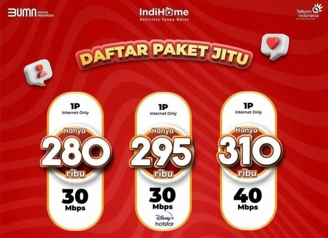 Paket JITU 2P (internet + telepon); kecepatan internet mulai dari 30 Mbps sampai 50 Mbps
