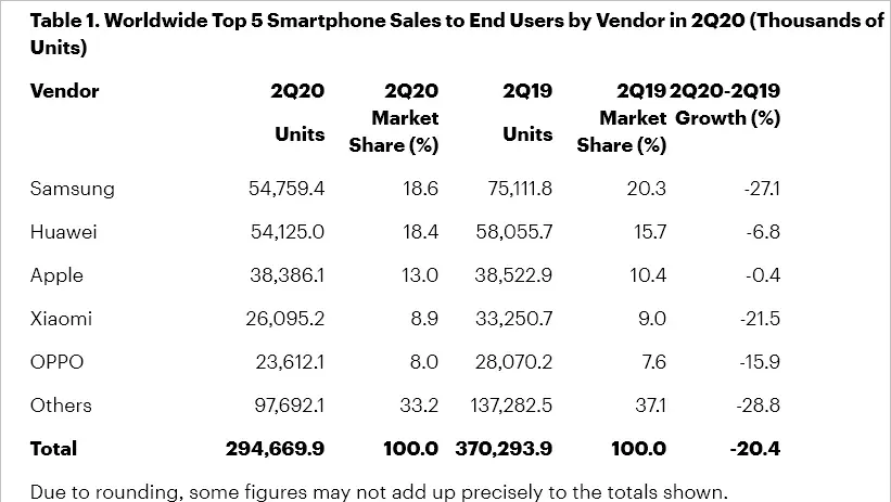 Selanjutnya, Huawei juga harus merasakan penurunan 6,8%, tapi mereka masih berada di peringkat kedua dengan pangsa pasar 15,7%. Sedangkan yang menempati posisi ketiga, Apple, dilaporkan tidak mengalami penurunan yang begitu drastis dengan hanya turun 0,4% dibanding periode yang sama tahun lalu.