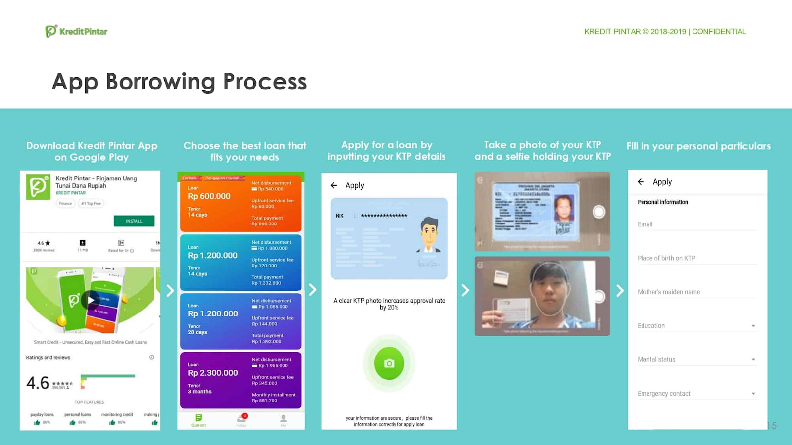 Pertama - tama, calon nasabah perlu mengunduh aplikasi Kredit Pintar melalui platform Play Store. Kemudian, calon nasabah perlu memasukkan data identitas diri, foto KTP dan swafoto wajah nasabah dengan KTP. Di halaman berikutnya, tersedia pilihan jumlah pinjaman yang nasabah inginkan, mulai dari ratusan ribu hingga dua puluh juta rupiah, tentunya dengan suku bunga dan lama pembayaran yang berbeda - beda.