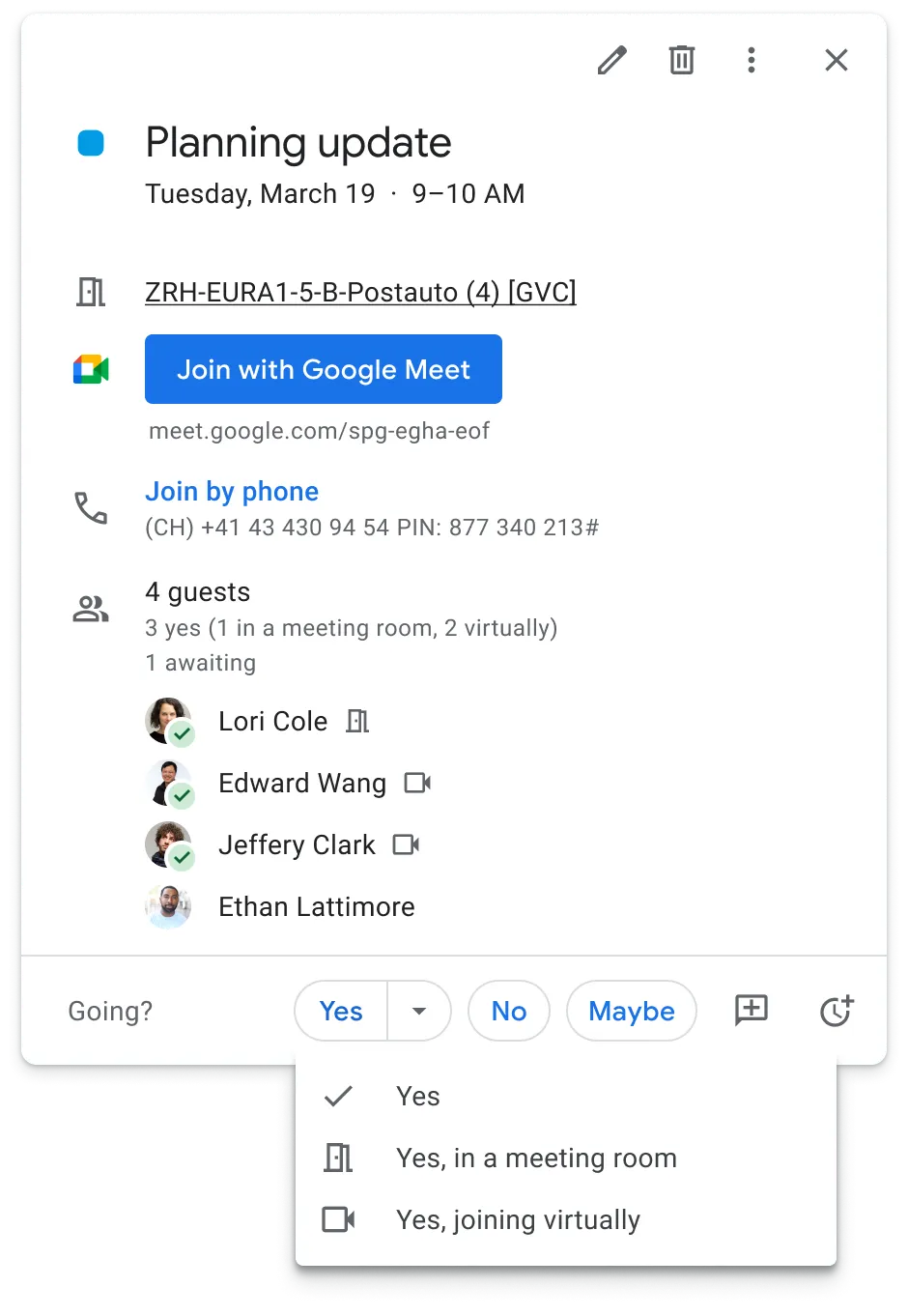 Kemudian, penyelenggara dan tamu akan dapat melihat bagaimana peserta berencana untuk menghadiri pertemuan dalam detail acara. Ini akan membantu peserta rapat mengetahui apa yang diharapkan saat bergabung ke rapat, dan mempersiapkannya sesuai dengan situasi tersebut.