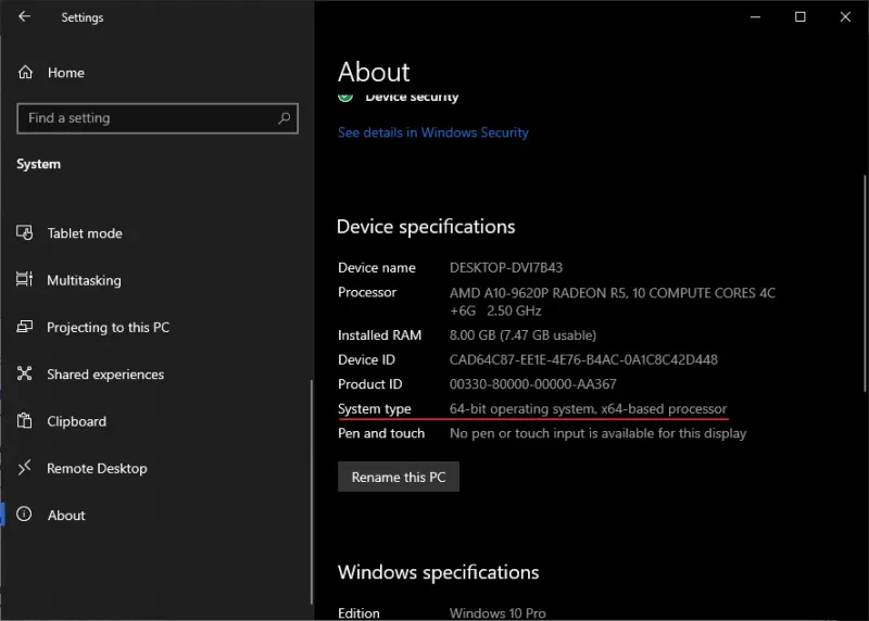 Pertama, silakan cek terlebih dahulu apakah prosesor kalian mendukung versi 64-bit atau tidak. Jika tidak mendukung, maka prosesorr kalian tidak memenuhi persyaratan sistem minimu. Kalian bisa cek melalui Settings > System > About. Kemudian pilih bagian informasi system type pada Device Specification.