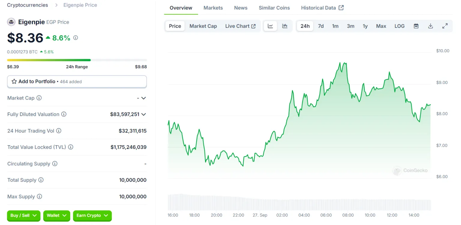 Eigenpie merupakan SubDAO dari Magpie yang terhubung dengan EigenLayer, yang berfokus pada restaking token ETH dan Liquid Staked Tokens (LSTs). EGP mempunyai batas pasokan maksimum yang ditetapkan sebesar 10 juta token. Dengan Fully Diluted Valuation (FDV) sebesar US$83 juta dan kapitalisasi pasar mencapai US$18 juta, valuasi token ini tergolong sangat rendah dibandingkan dengan Total Value Locked (TVL) protokolnya yang mencapai US$1,17 miliar. Hal ini mengindikasikan bahwa proyek ini memiliki potensi besar, yang belum sepenuhnya terungkap.