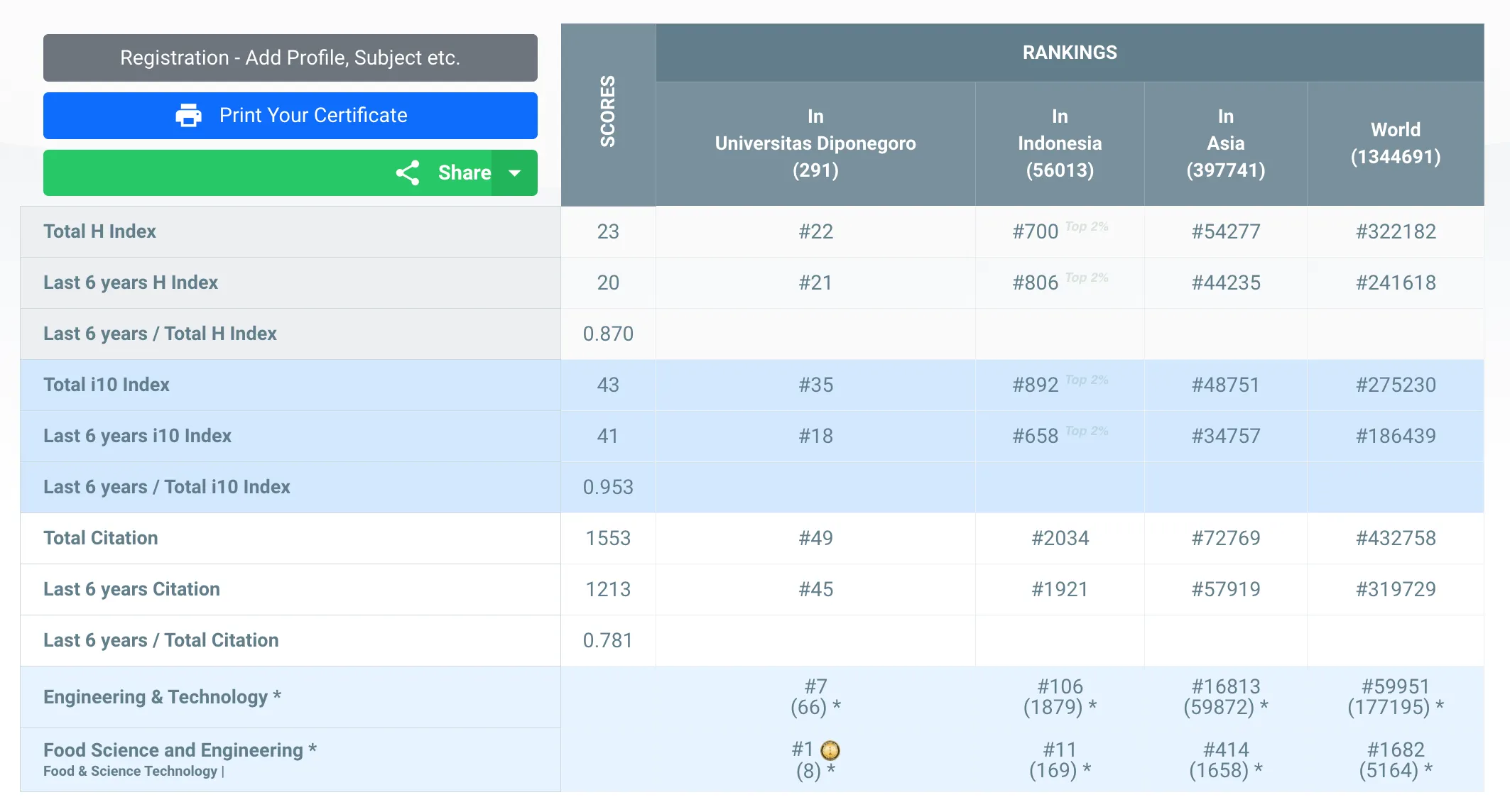 Dengan hasil skor yang tertera di bawah, Fronthea Swastawati menempati peringkat #22 Universitas (Universitas Diponegoro), #700 Indonesia, #54277 Asia, #322182 Dunia secara keseluruhan subjek yang termasuk ke dalam kategori AD Scientific Index 2023.
