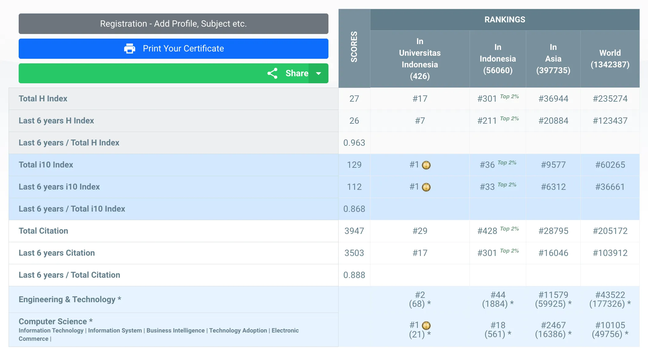 Dengan hasil skor yang tertera di bawah, Achmad Nizar Hidayanto menempati peringkat #17 Universitas (Universitas Indonesia), #301 Indonesia, #36944 Asia, #235274 Dunia secara keseluruhan subjek yang termasuk ke dalam kategori AD Scientific Index 2023.