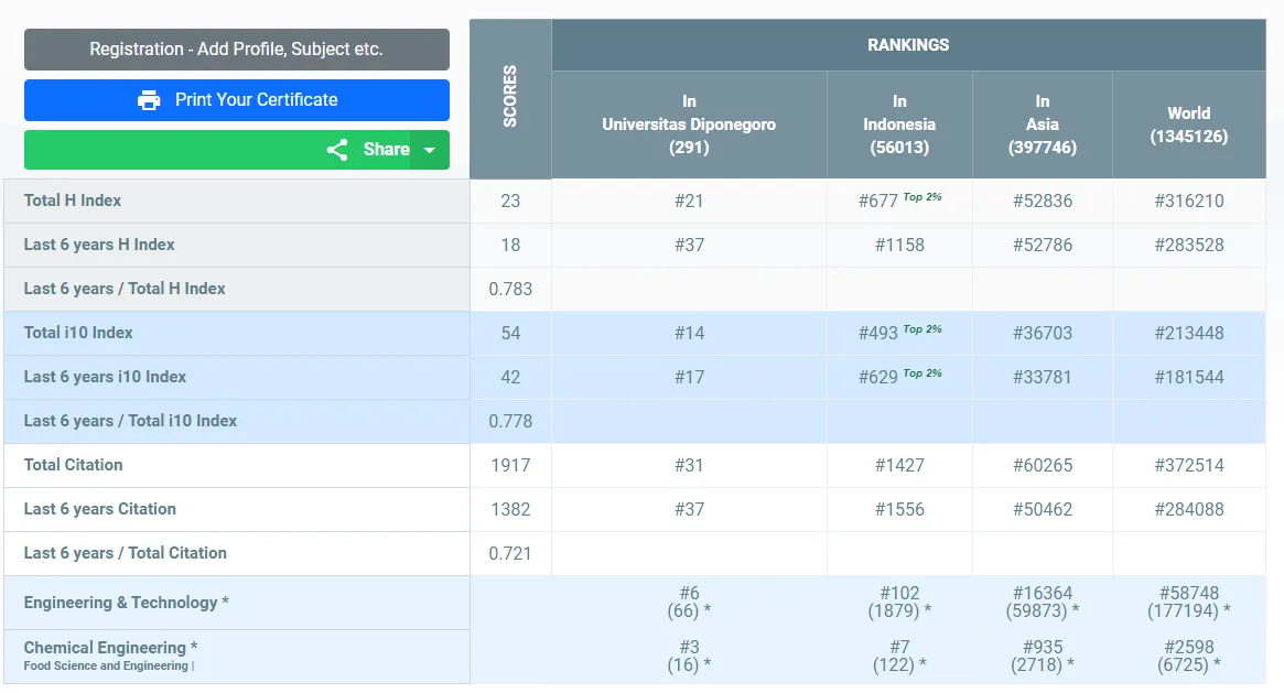 Dengan hasil skor yang tertera di bawah, Andri Cahyo Kumoro menempati peringkat #21 Universitas, #677 Indonesia, #52836 Asian, dan #316210 Dunia secara keseluruhan subjek yang termasuk ke dalam kategori AD Scientific Index 2023.