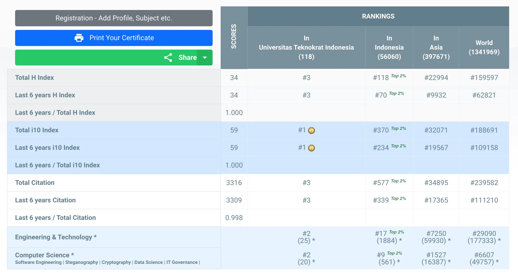 Dengan hasil skor yang tertera di bawah, Dedi Darwis menempati peringkat #3 Universitas (Universitas Teknokrat Indonesia), #118 Indonesia, #22994 Asia, #159597 Dunia secara keseluruhan subjek yang termasuk ke dalam kategori AD Scientific Index 2023.