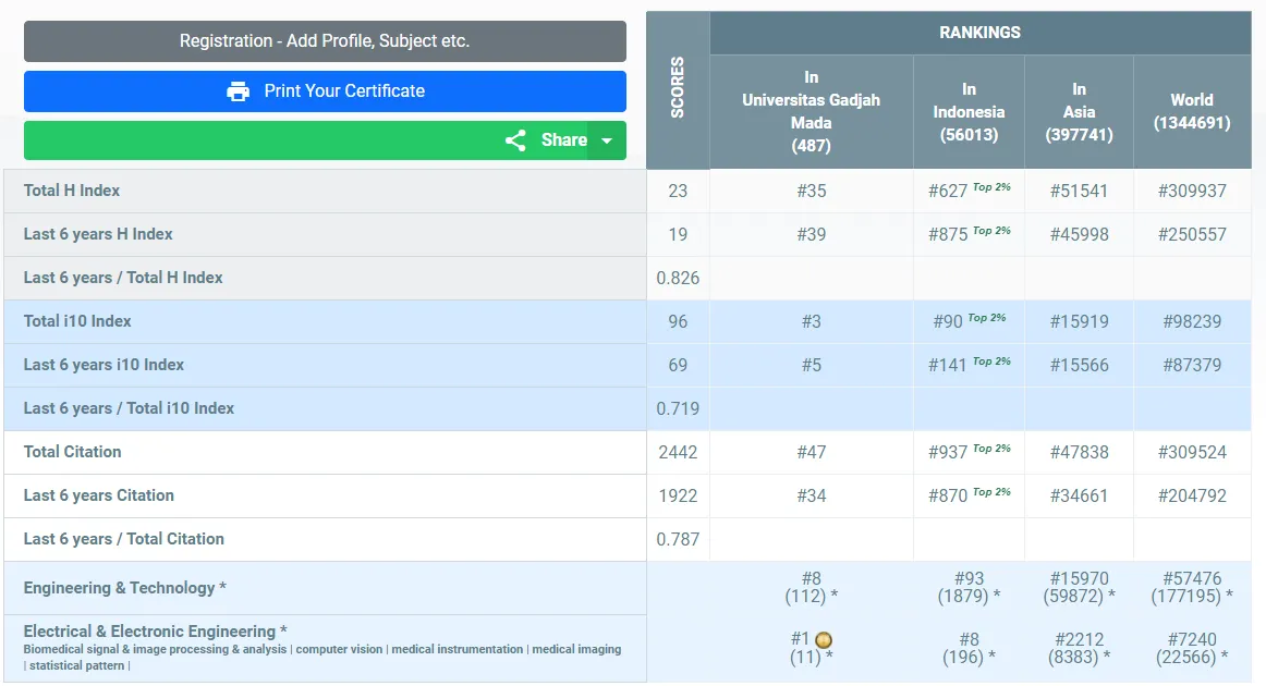 Dengan hasil skor yang tertera di bawah, Hanung Adi Nugroho menempati peringkat #35 Universitas, #627 Indonesia, #51541 Asian, dan #309937 Dunia secara keseluruhan subjek yang termasuk ke dalam kategori AD Scientific Index 2023.