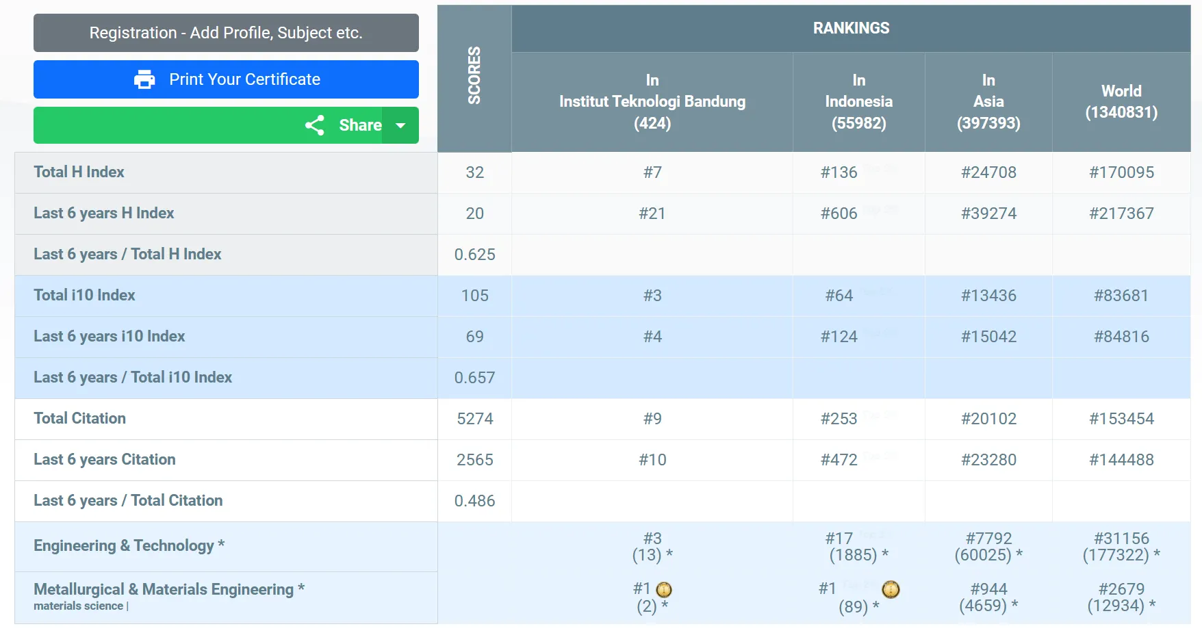 Dengan hasil skor yang tertera di bawah, Mikrajuddin Abdullah menempati peringkat #7 Universitas, #136 Indonesia, #24708 Asia, dan #170095 Dunia secara keseluruhan subjek yang termasuk ke dalam kategori AD Scientific Index